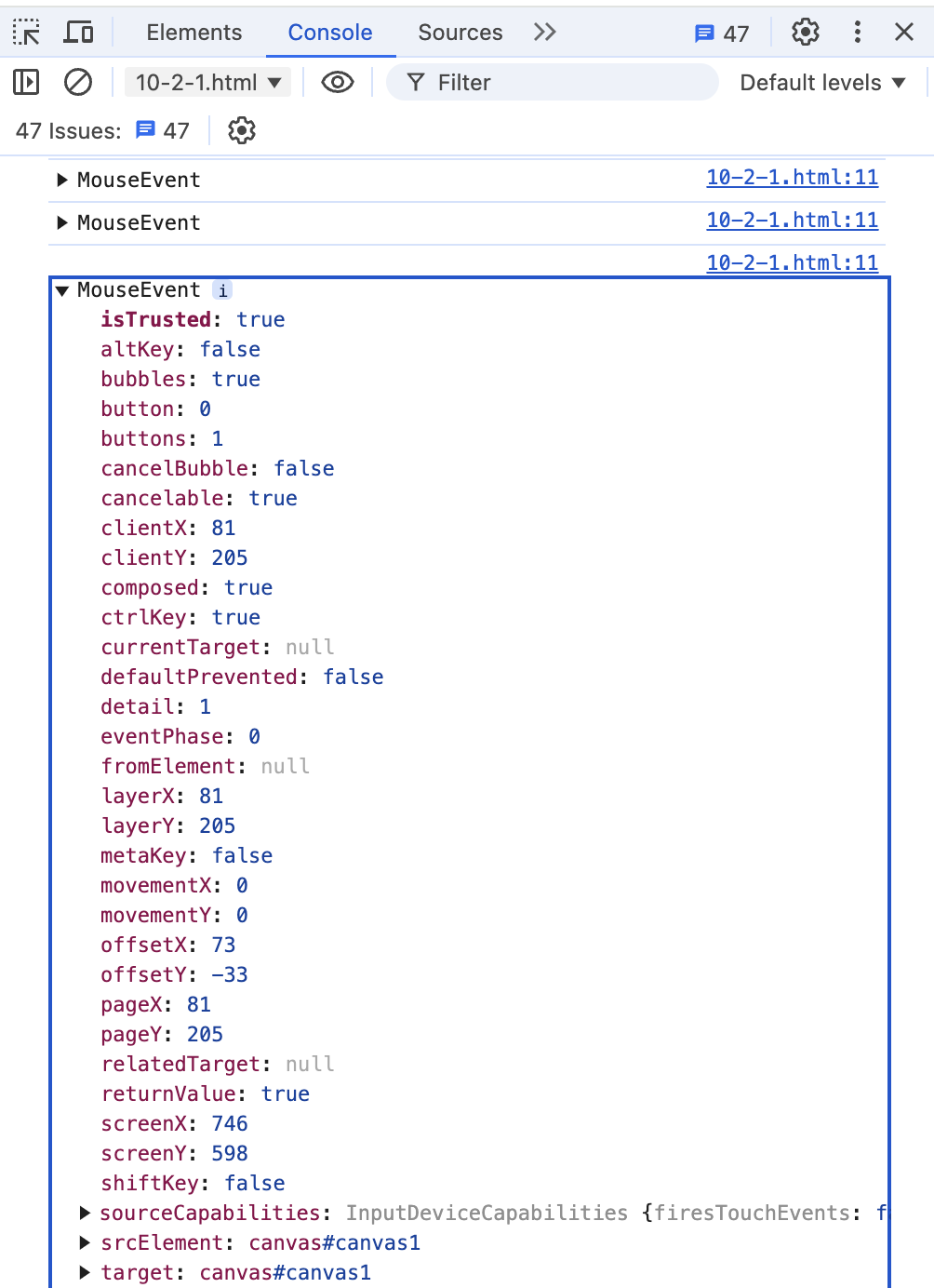 コンソールを開き,キャンバスの上をマウスでクリックしてみて,イベントを確認してみましょう.クリックするたびにコンソールには以下のようなイベントが表示されます.
